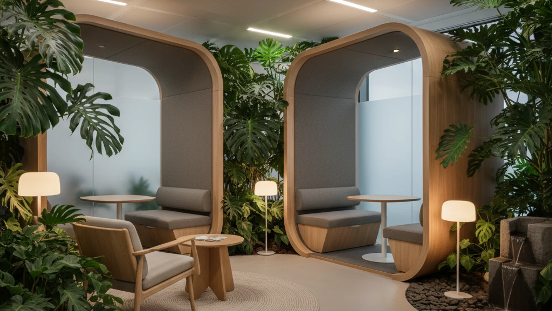 В офісному контексті зона тиші може виконувати функцію третього місця — простору, що не є ні робочим столом, ні переговорною, а чимось іншим. Місце, де можна подумати, відновитися, переключитися. Акустичні кабіни для офісу, розміщені не лише в робочій зоні, а й у зоні відпочинку, посилюють цей ефект.